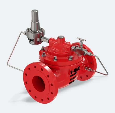 Automatically reduces a higher inlet pressure to constant lower outlet pressure. The valve consists of a main valve and a VT 15 pressure reducing control pilot. Slight changes in downstream pressure acts on topside of control diaphragm causing main Valve to counteract pressure changes and hold a constant outlet pressure. The regulator will reduce the upstream pressure to a constant downstream pressure regardless of the change in flow rotes/or inlet pressure. The pilot is a Normally - Open valve that senses the downstream pressure.
